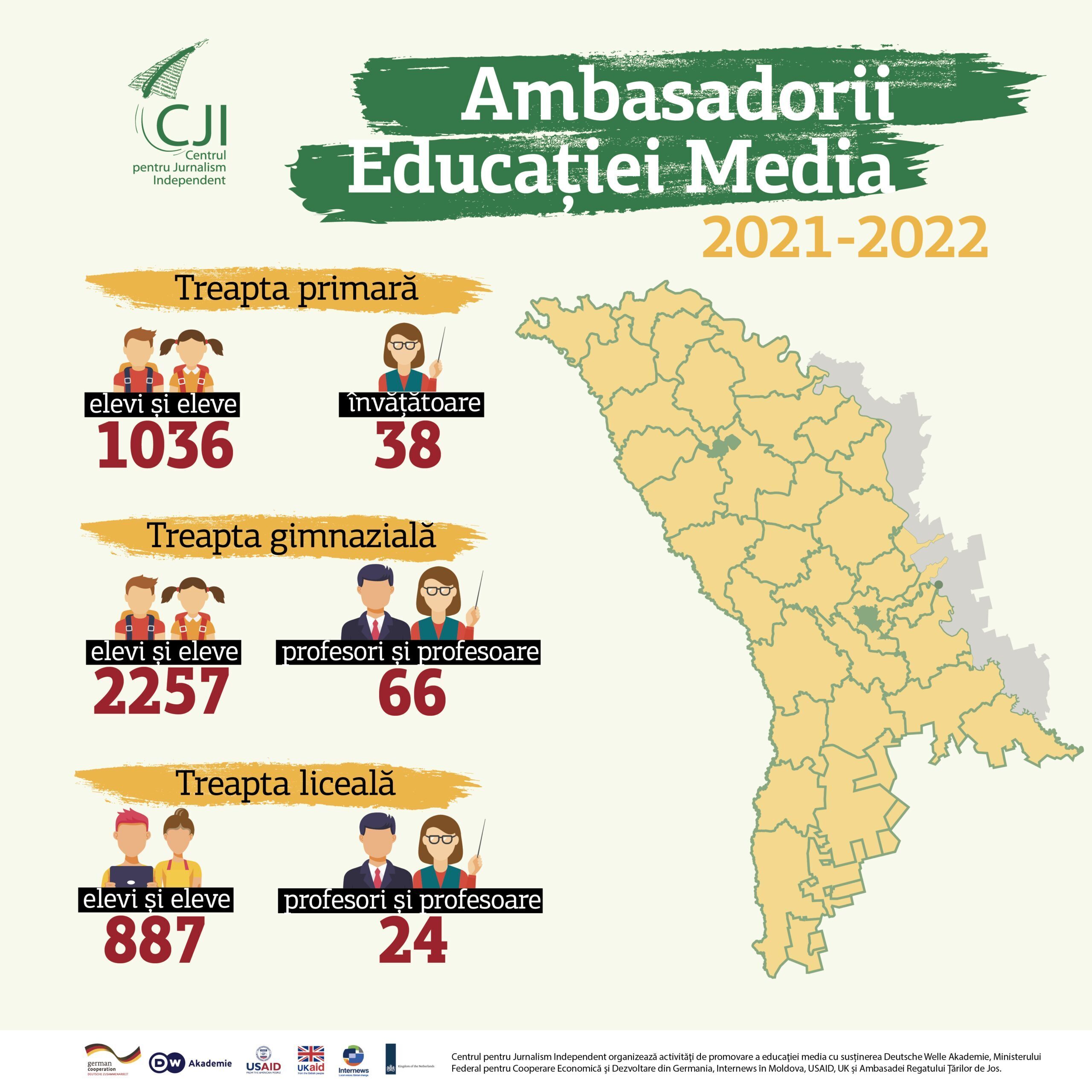 În anul de studii 2021-2022, 128 de pedagogi care și-au format competențe media în ultimii ani predau disciplina opţională Educație pentru media unui număr de 4,180 de elevi din 103 şcoli de pe întreg teritoriul ţării. Sunt cele mai mari cifre înregistrate de la introducerea disciplinei în programul școlar în 2017. În același timp, numărul pedagogilor care interacţionează cu domeniul este mult mai mare, având în vedere că manualele de Educaţie pentru media sunt folosite ca materiale didactice şi în cadrul altor discipline şcolare sau opţionale, precum şi la orele de diriginţie în diferite clase.