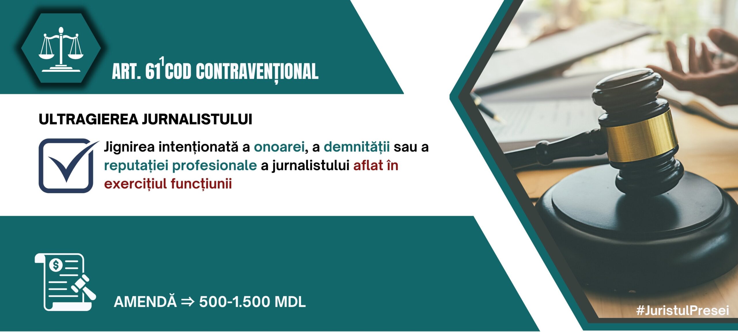 Pe lângă sancțiunile penale, legea introduce două contravenții noi. Este vorba despre ultragierea jurnalistului, adică jignirea intenționată a onoarei, demnității sau reputației profesionale a jurnalistului aflat în exercițiul funcției. Această faptă va fi sancționată cu amendă între 500 și 1.500 de lei. Prevederea este similară protecției acordate altor categorii profesionale și are un rol preventiv.