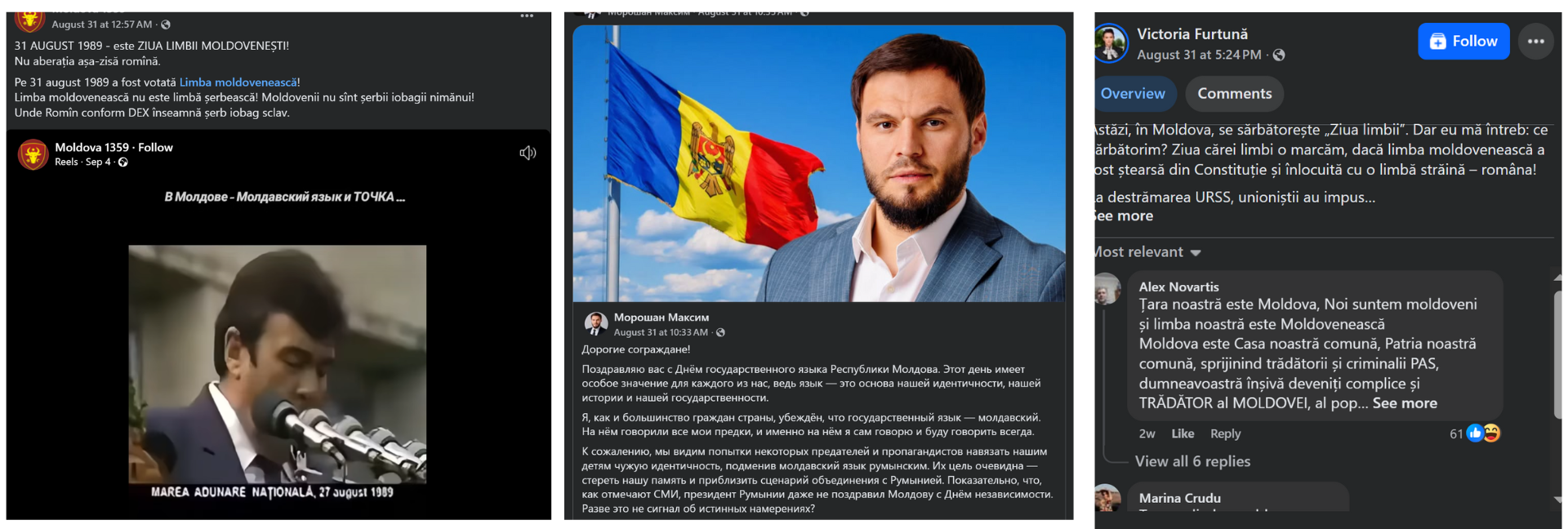 Непосредственно 31 августа на странице Moldova 1359, связанной с организацией, которой руководит Николае Паскару, отмечается, что «31 августа 1989 года ‒ ДЕНЬ МОЛДАВСКОГО ЯЗЫКА! Не аберрация так называемого румынского. 31 августа 1989 года проголосовали за молдавский язык! Молдавский язык ‒ это не язык крепостных! Молдаване не являются чьими-то крепостными! Где румын, согласно DEX [Толковый словарь румынского языка ‒ прим. перев.], означает крепостной, раб». И активист Патриотического избирательного блока (BEP) Максим Иордан также воспользовался этим днем как поводом для нападок на правящую партию. В публикации группы Moldova News он ссылается на праздник Limba Noastră и уточняет, что «есть еще один язык, который слишком часто пытаются навязать обществу ‒ язык силы. Его используют власти в лице PAS, когда вместо диалога выбирают давление. Этот язык пугает людей. Важно помнить: язык силы от PAS нужно забыть, а молдавский язык культуры, памяти и человеческого достоинства ‒ беречь и передавать нашим потомкам».