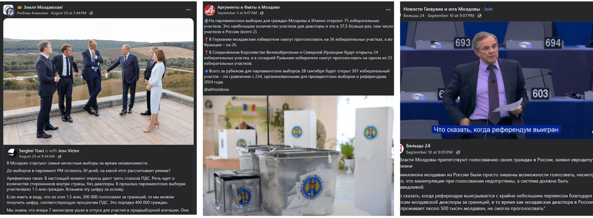 В группах, связанных с оппозицией, такие активисты, как Сергей Ткач, прибегли к расчетам заговорщического толка: ПДС будет стремиться получить 750 000 голосов, из которых 250 000-280 000 будут сфальсифицированы в диаспоре с помощью «спецслужб стран ЕС». «Так сможет ли правящая партия набрать за рубежом еще раз 250 000 голосов? С учетом открытия новых участков и тотальной „поддержки” спецслужб стран ЕС возможно и 280 000. Не зря же Макрон, Мерц и Туск прилетали на День независимости, а президент Румынии прибудет 31 августа на День румынского языка! Не просто ведь поагитировать за Санду и ПДС. Куда важнее обсудить как обеспечить электоральную победу режиму страны, которая стала важной частью российско-украинского конфликта и планов его продолжения». Отмечая в этом контексте и малое число участков в России, он указывает, что «это самые нечестные выборы за всю историю».