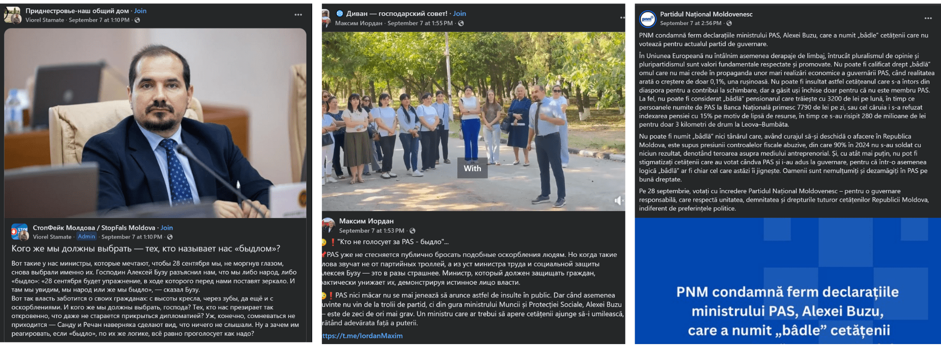 В первую неделю сентября министр труда и социальной защиты Алексей Бузу на встрече с избирателями в селе Пелиния Дрокиевского района заявил, что парламентские выборы в сентябре покажут, «народ мы или быдло». Несмотря на то, что позже министр принес публичные извинения за свое неудачное изречение, этот эпизод был быстро использован соперниками на выборах и медиаисточниками, связанными с оппозицией, как свидетельство презрения правительства к гражданам. В общей сложности посты, идентифицированные по этой теме, набрали почти 30 000 просмотров и более 10 000 лайков.