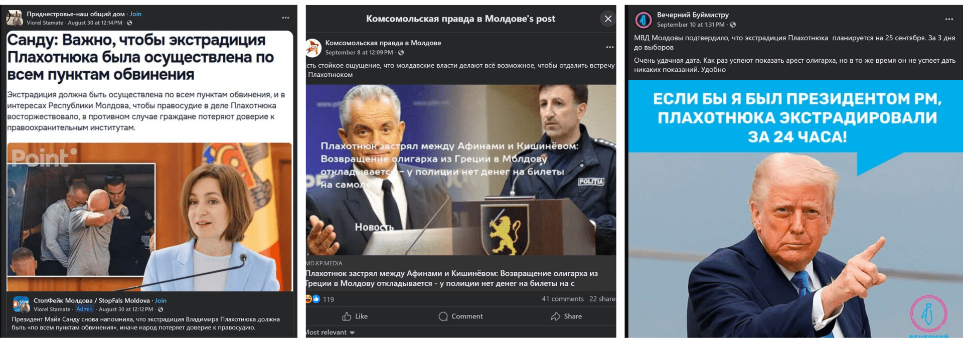 «МВД Молдовы подтвердило, что экстрадиция Плахотнюка планируется на 25 сентября. За 3 дня до выборов. Очень удачная дата. Как раз успеют показать арест олигарха, но в то же время он не успеет дать никаких показаний. Удобно», ‒ написал блогер Дмитрий Буймистру, как только эта дата была подтверждена властями. Его пост включает изображение президента США Дональда Трампа с надписью «Если бы я был президентом РМ, Плахотнюка экстрадировали бы за 24 часа».