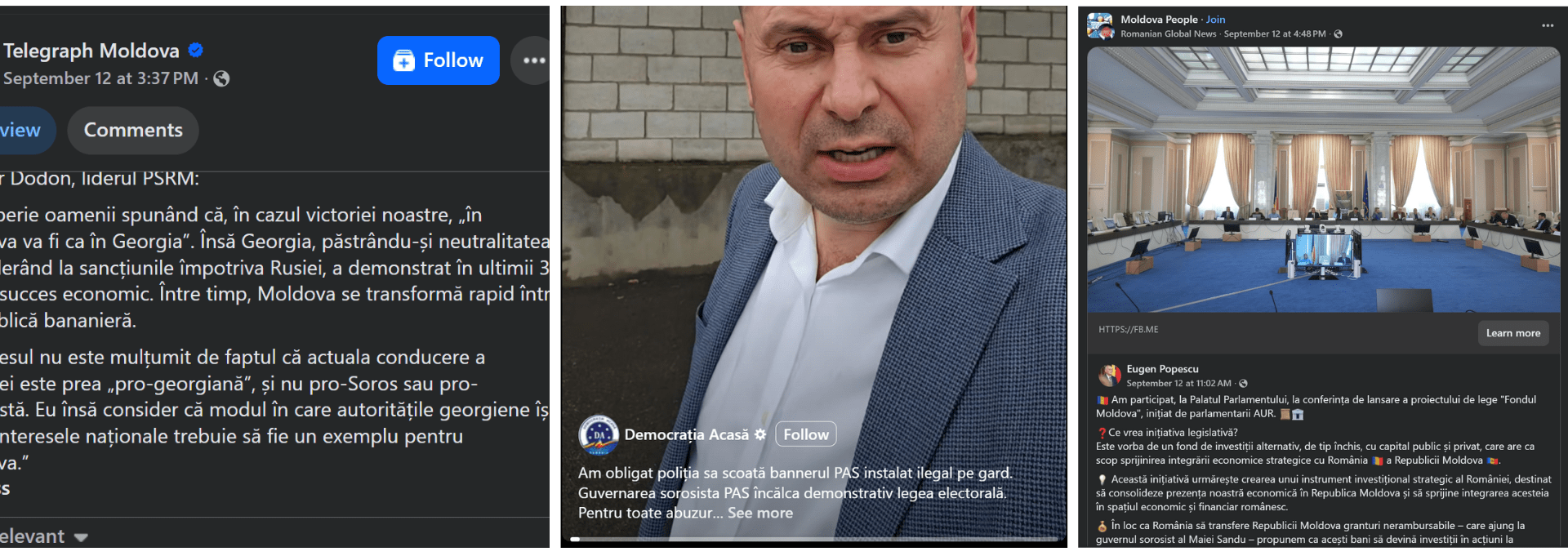 Например, новость о законодательной инициативе «Фонд Молдова» (предложении, обсуждаемом в Бухарестском парламенте депутатами AUR) была распространена по группам в Республике Молдова с комментарием: «Вместо того, чтобы Румыния передавала Республике Молдова невозвратные гранты, которые в конечном итоге окажутся в руках соросовского правительства Майи Санду, мы предлагаем, чтобы эти деньги стали инвестициями в акции компаний из Республики Молдова». Такая переформулировка превращает дискурс об иностранной помощи в инструмент создания нарратива об экономическом и политическом захвате.